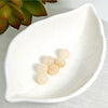 White leaf-shaped dish with pink and clear polished stones and 7mm moonstone beads