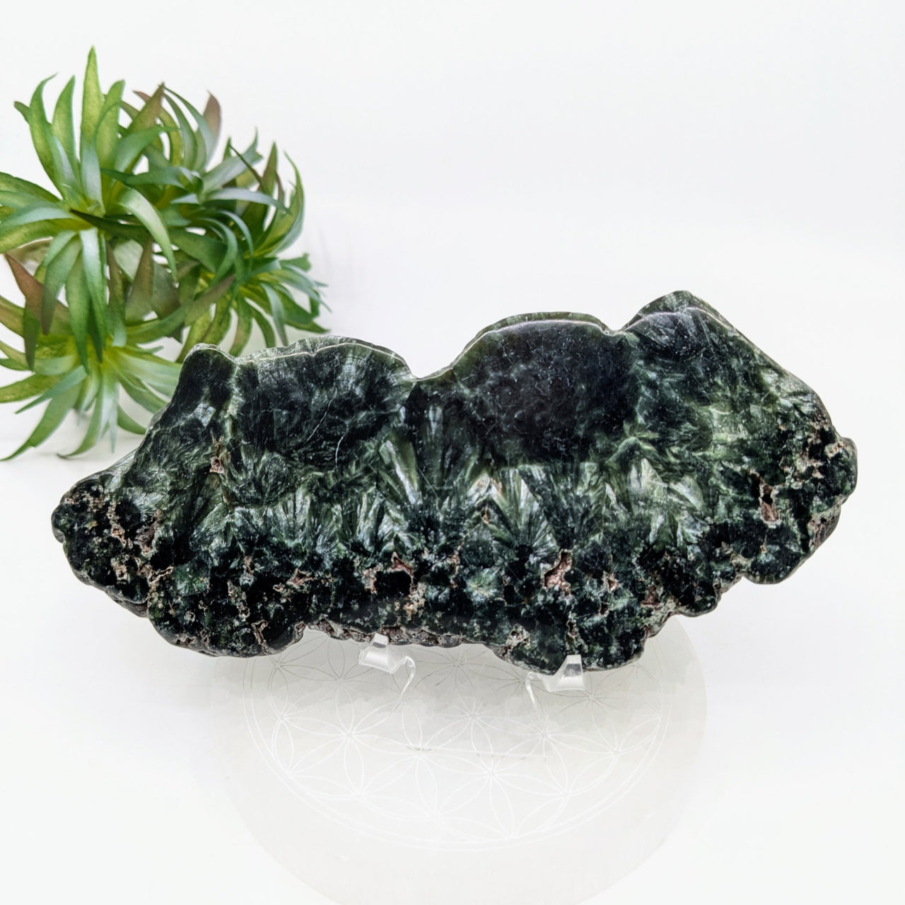 Seraphinite is named after the biblical seraphs or seraphim angels, due to its appearance of feathery patterns that resemble wings, And indeed, this crystal also emanates the highest spiritual vibration for all purposes. It has a strong attunement to the Crown Chakra, Divine Feminine energies, and Benevolent Spirit Beings. It works at the most subtle levels so used for meditation and prayer and to help to understand past lives and karmas.